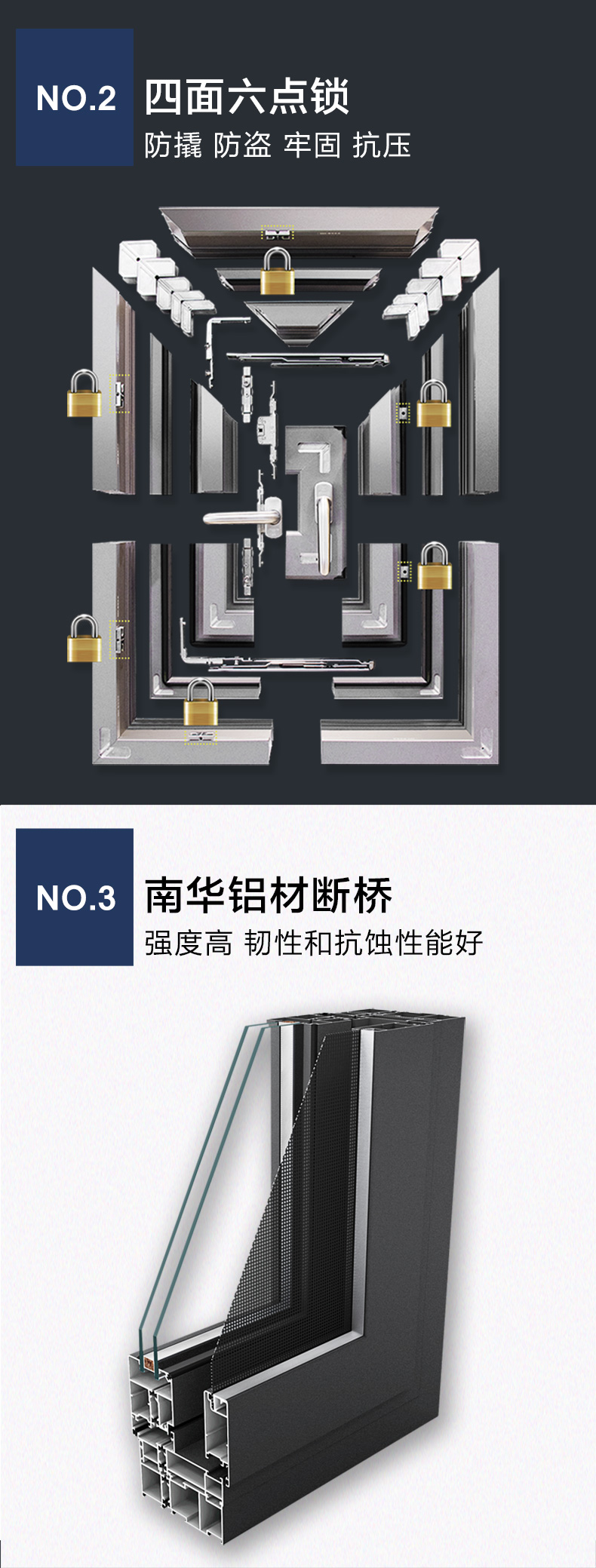四面六点锁安全性能优越。以断桥铝型材制作多腔体,为声音的传递设置更多障碍,极大削弱声音的传递。中空玻璃则通过填充惰性气体及暖边技术、双面压胶条密封技术,有效降低声波的共振效应,达到明显的隔音效果。